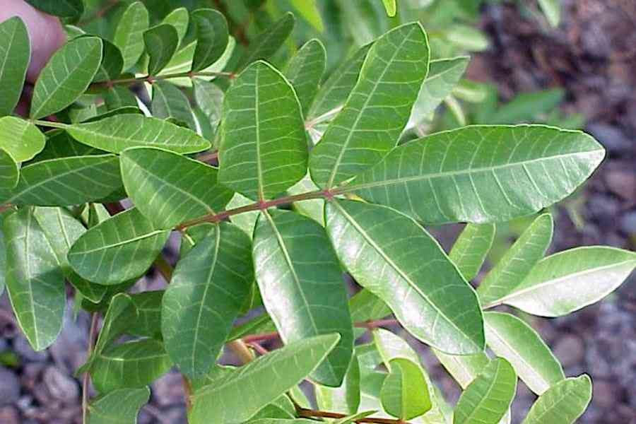 Folhas: Folhas compostas, imparipidadas, membranáceas, verde-escuras, pecíolo com pequena asa lateral; com 9 a 11 folíolos, sésseis, oblongo-elípticos, ápice agudo, base assimétrica, nervura central proeminente na face inferior, bordos serreados, com forte cheiro de manga.