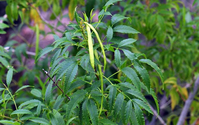 Folhas opostas, verdes brilhantes, compostas por folíolos ovais-lanceolados, sub-sésseis e de bordas serrilhadas. É perene em climas tropicais, mas decídua em lugares mais frios.