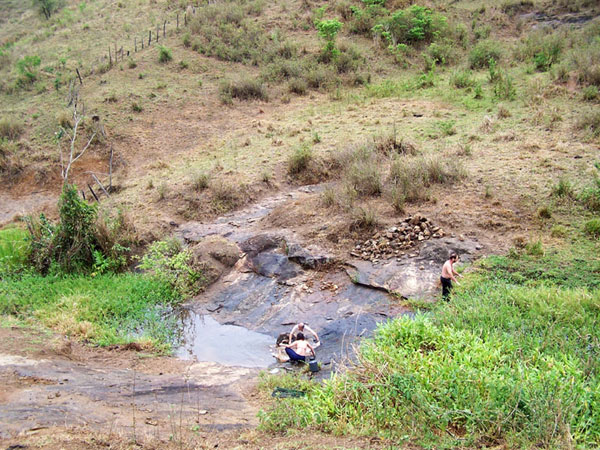 Foto 82 Córrego afluente do Córrego das Novas, na estrada para Itanhém nas proximidades de Geribá.(Arion, Ronaldo e Carine) Córrego afluente do Córrego das Novas da estrada para Itanhém nas proximidades de Geribá. Montanhas entre Palmópolis e Itanhém. .