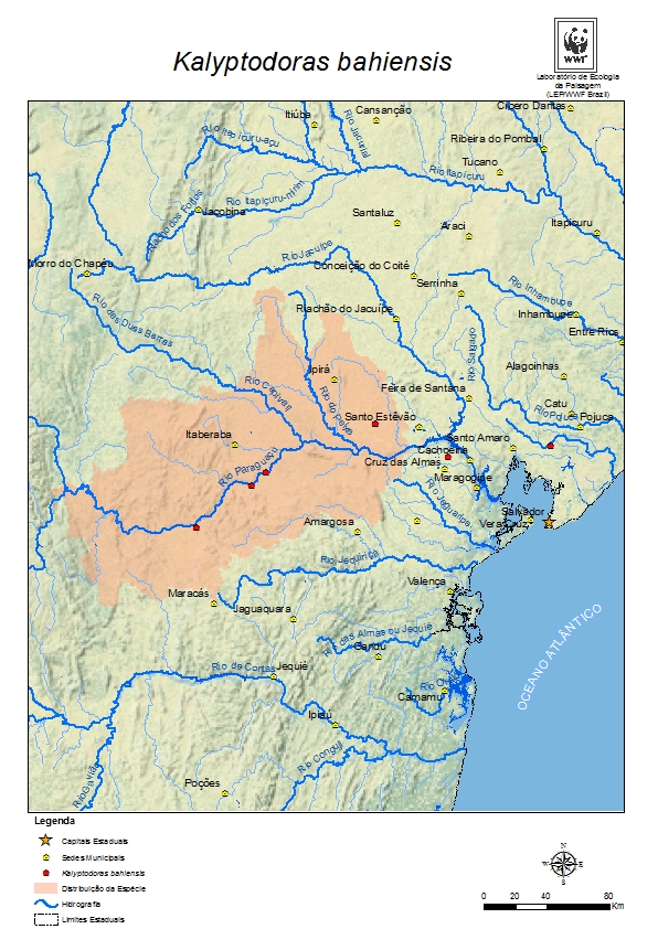 - Distribuição (pontos vermelhos) Kalyptodoras bahiensis é endêmica do Brasil e presença distribuição geográfica restrita ao rio Paraguaçu, Bahia (Birindelli 2008, Higuchi et al. 1990). Originalmente foi registrado para o baixo rio Paraguaçu, na cachoeira de Bananeiras (Higuchi et al. 1990). Esta região foi representada na década de 1980, dando origem à barragem de Pedra do Cavalo. Desde então, uma espécie não foi mais registrada no local, possivelmente devido à mudança do ambiente. Recentemente a espécie foi reencontrada no rio Paraguaçu, em localidades próximas aos municípios de Itaberaba e Iaçu (Birindelli 2008). A Extensão de ocorrência (EOO) foi calculada em 15.566 km2.