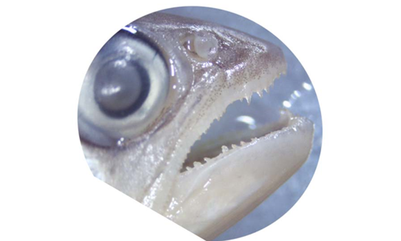 | 2B | Dentário com duas séries de dentes; dentes de uma mesma série do premaxilar e dentário sub-iguais, sem dentes destacados na sínfise; dentes da fileira externa do premaxilar sob lábio superior; grande número de dentes em cada série tanto no pré-maxilar quanto no dentário. | Salminus | ![]() |