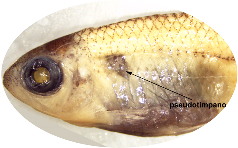 | 1A | Pré-maxilar e dentário com uma única série de dentes; maxilas providas de 8 ou mais pequenos dentes cuspidados; pseudotímpano presente, em formato triangular (pseudotímpano é uma área de pele fina, atrás da cabeça e pouco acima da linha lateral que permite a passagem sonora até a bexiga natatória). | Serrapinnus | ![]() |