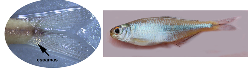| 3B | Nadadeira caudal escamada na base; mancha humeral presente, verticalmente alongada, as vezes esmaecida; macho sem glândula caudal. | Knodus | ![]() |