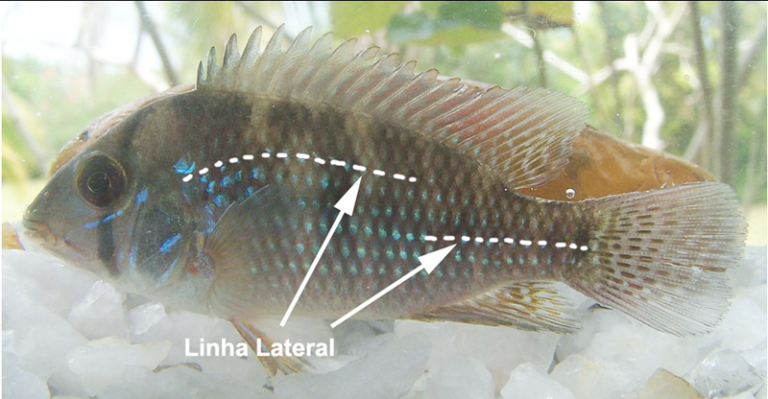 | 1A | Linha lateral dividida em dois ramos. Ramo superior prolongando-se da parte posterior da cabeça até a vertical da nadadeira dorsal e ramo inferior do meio do corpo a base da caudal. | Cichlidae | ![]() |