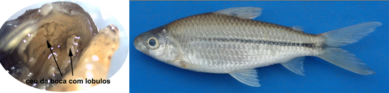 | 1B | Céu da boca sem processos lobulares; boca terminal; faixa inconspícua ao longo da linha lateral, as vezes larga; 33 a 38 escamas na linha lateral. | Cyphocharax | ![]() |
