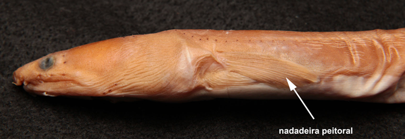 | 1B | Cauda flexível, com uma nadadeira caudal visível externamente e confluente com a dorsal e a anal; nadadeiras peitorais reduzidas. | 2 | ![]() |