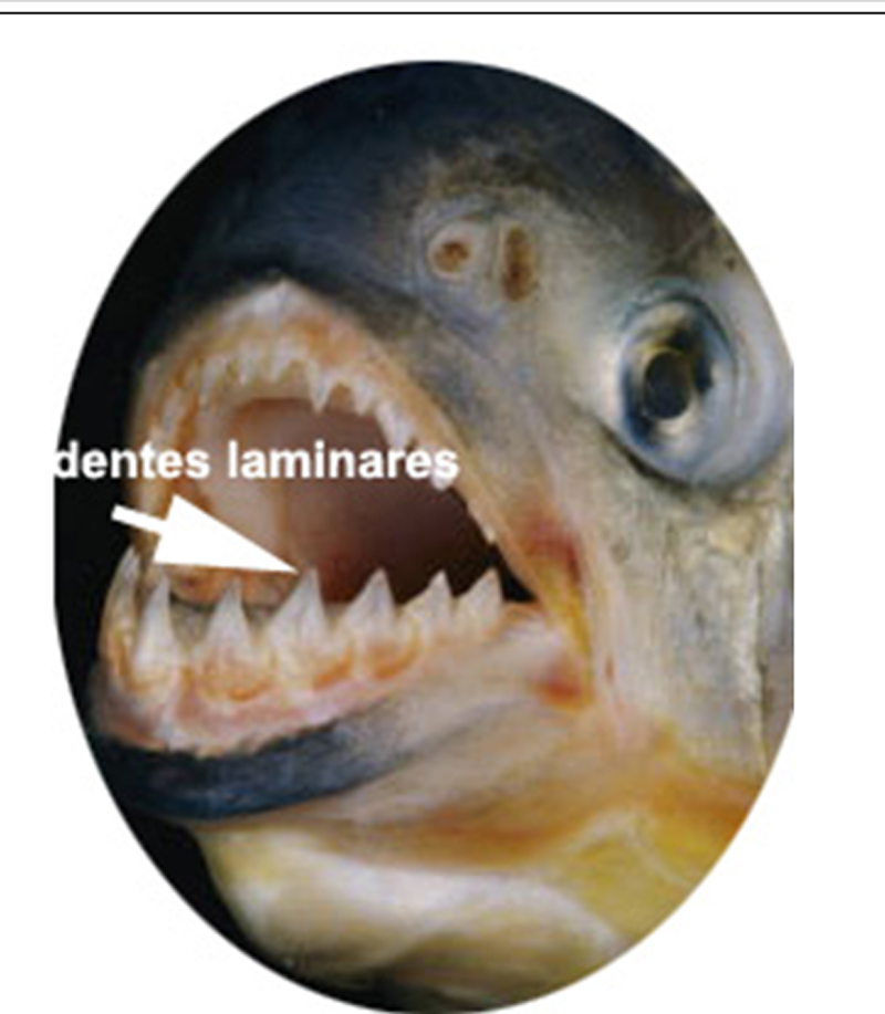 | 1B | Premaxilar com uma fileira de dentes; dentes em geral laminares; dentário formando uma fileira contínua, sem dentes cônicos. | 4 (Serrasalminae) | ![]() |
