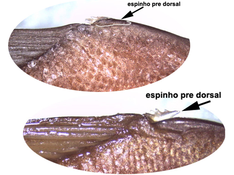 | 2A | Espinho pré-dorsal presente (voltado para a frente, visível após dissecção da pele, como ilustrado). | 3 | ![]() |
