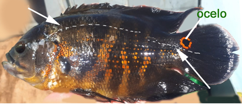 Algumas características do gênero Astronotus estão indicadas na figura acima.