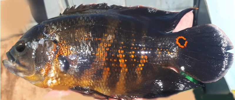 Algumas características da espécie Astronotus ocellatus estão indicadas na figura acima.