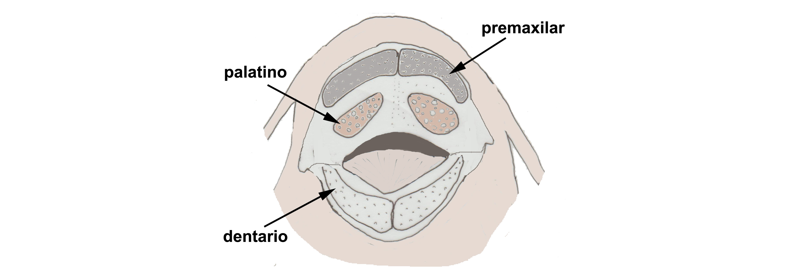 Peixes Cathorops possuem placas dentígeras acessórias no palatino fixas no palato, com dentes molariformes e arredondados.