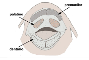 | 3A | Placas dentígeras acessórias no palatino pequenas, agregadas em duas projeções carnosas salientes, nas laterais do palato, com dentes viliformes ou cônicos; processo cleitral posterior longo. ![]() | Genidens | ![]() |