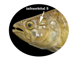 | 1B | Nadadeiras caudal, dorsal, adiposa, anal e pélvica transparentes ou amareladas; osso infraorbital 5 (io 5) aproximadamente tão alto quanto largo. | 2 | |