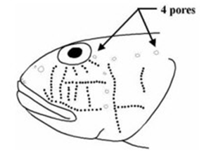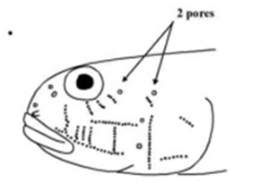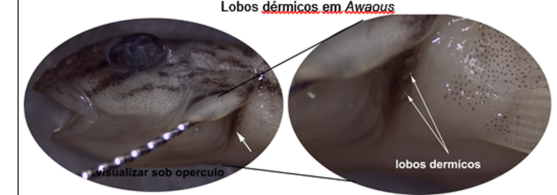 1AMargem posterior da câmara branquial (no arco clavicular, coberto pelo opérculo) com lobos dérmicos.Awaous