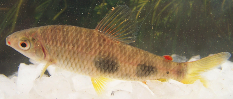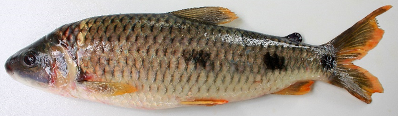 | 1A | Canto do lábio vermelho; nadadeira adiposa vermelha, pequena; colorido do corpo com três grandes máculas arredondadas, dispostas abaixo da linha lateral; focinho alongado; 38 a 40 escamas perfuradas na linha lateral. | Leporinus copelandii | ![]() |