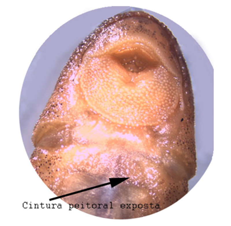 | 1B | Superfície ventral da cintura peitoral coberta por pele ou placas, na região ventral a base do coracóide. | 3 | ![]() |