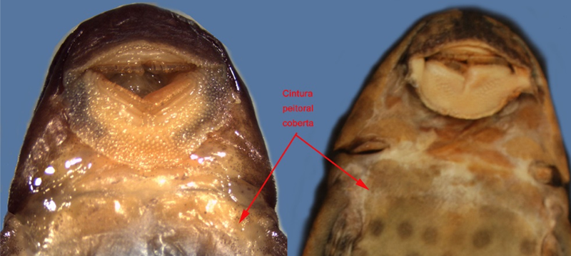 | 1A | Superfície ventral da cintura peitoral exposta (com odontóides sobre a pele pelo menos parcialmente). (Hypoptopomatinae) | 2 | ![]() |