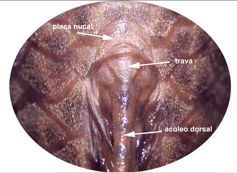 | 2A | 12 raios ramificados na nadadeira caudal; odontóides na região postero-dorsal da cabeça dispostos em fileira. | Otothyris | ![]() |