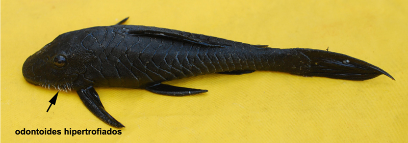 | 5A | Colorido do corpo preto uniforme; odontoides hipertrofiados na altura do opérculo. | Pogonopoma | ![]() |