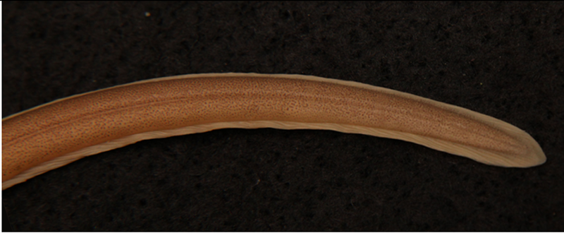 1BCauda flexível, com uma nadadeira caudal visível externamente e confluente com a dorsal e a anal;