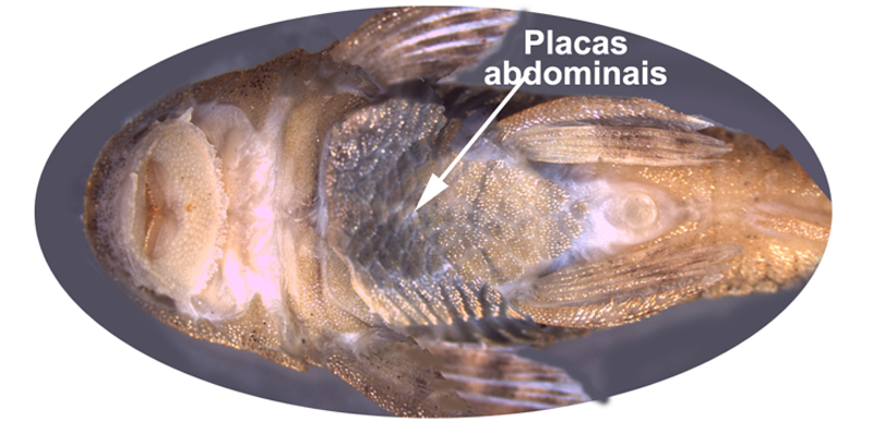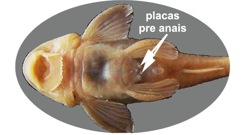 | 1B | Topo de cabeça com tufo de odontoides; 25 a 26 placas longitudinais; olhos pequenos, 15 a 19% no comprimento da cabeça; corpo robusto, largura do corpo 23 a 27% no comprimento padrão; abdome nu, apenas diminutas placas pré anais na altura das nadadeiras pélvicas. | Parotocinclus arandai | ![]() ![]() |