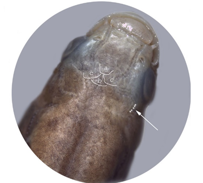 | 1B | Escamas da região frontal distribuídas transversalmente; escama “A” sempre com a borda posterior livre; 11 a 20 raios na nadadeira dorsal. | 3 | ![]() |