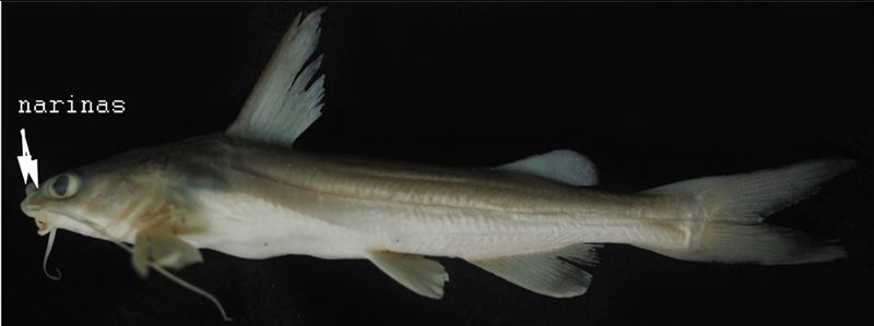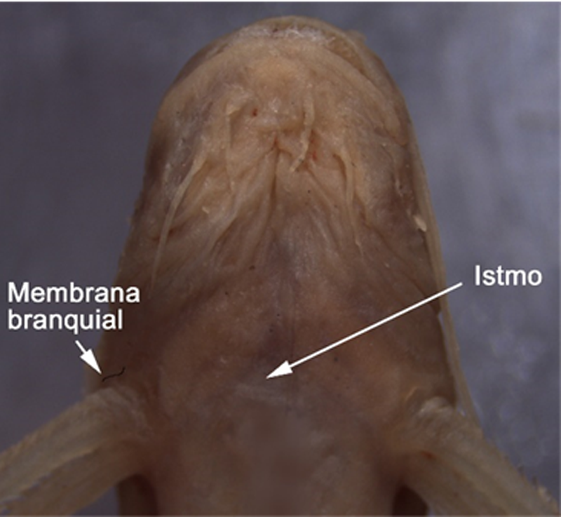 | 4A | Aberturas branquiais amplas, membranas branquiais livres do istmo; sulco suborbital raso, junto a base do barbilhão maxilar, ou ausência de sulco. | 5 | ![]() |