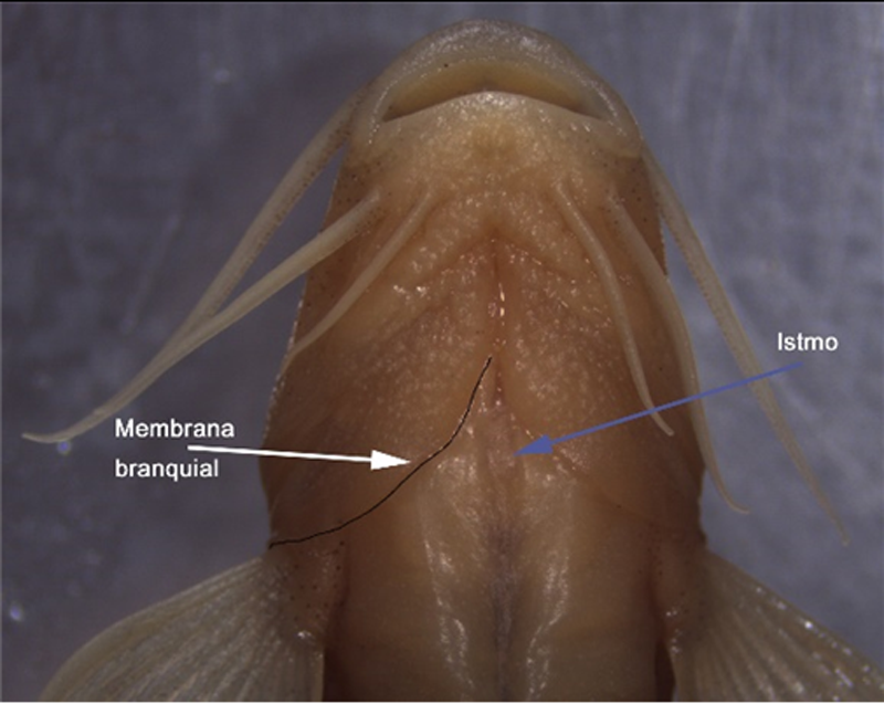 | 4B | Aberturas branquiais pequenas, membranas branquiais unidas ao istmo; sulco suborbital presente, sulcado para abrigar o barbilhão maxilar quando em posição de repouso. | Auchenipteridae | ![]() |