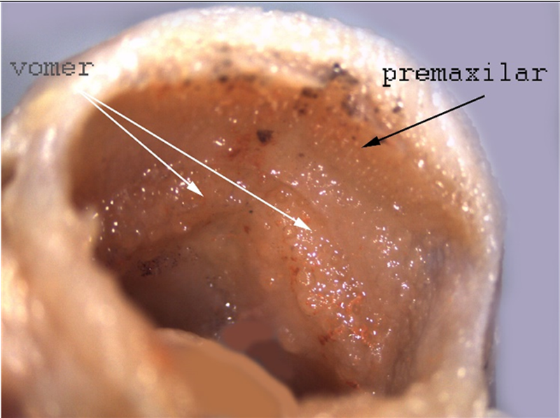 | 2B | Narinas anteriores e posteriores visivelmente afastadas entre si (setas); fontanela limitada pelo frontal e/ou mesetmóide, mas nunca com aberturas sobre etmóide lateral. | 3 | ![]() |