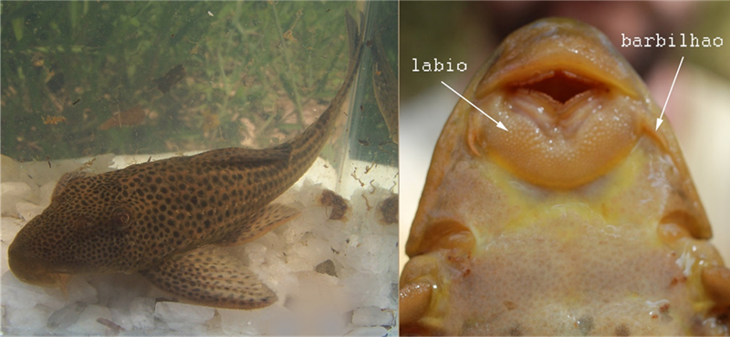 | 7B | Várias séries longitudinais de placas na porção anterior do corpo; boca inferior; lábios desenvolvidos em forma de ventosa. | Loricariidae | ![]() |