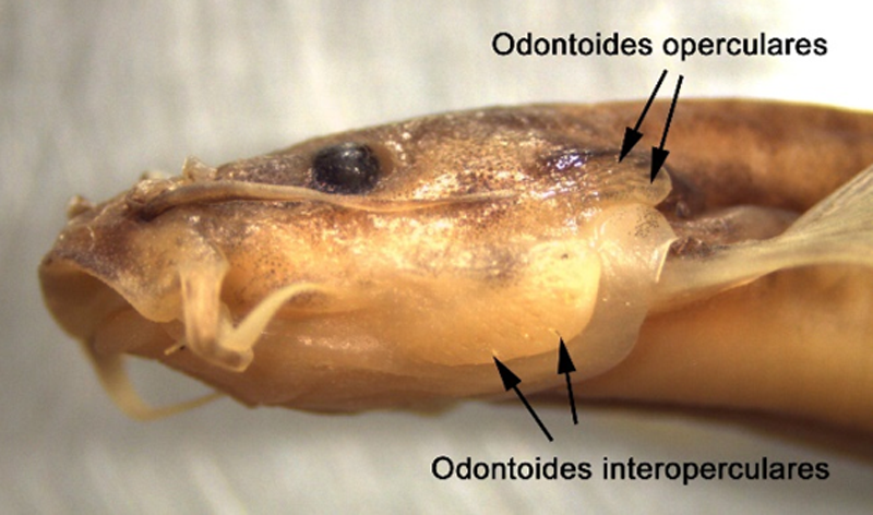| 2B | Nadadeira dorsal posicionada a frente da vertical da nadadeira anal; nadadeira pélvica com 4 raios ramificados; fontanela craniana posterior ampla em forma de fenda, estendendo-se entre frontais e parieto-supraoccipital. | Trichomycterus | ![]() |