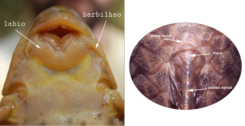 Algumas características do gênero Hypostomus estão indicadas na figura acima.
