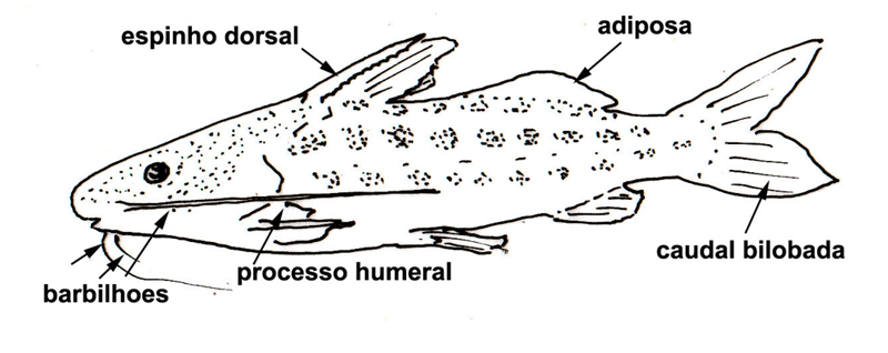 Algumas características da família Pimelodidae, são ilustradas na figura acima.