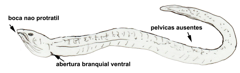 Estes peixes são facilmente reconhecidos pelo corpo alongado, com ausência de nadadeiras peitorais, pélvicas. As nadadeiras dorsal e anal são rudimentares, limitadas a uma dobra de pele contígua a caudal. As membranas branquiais são fusionadas entre si, em uma fenda única, funcionando como uma abertura branquial ventral. Possuem olhos pequenos cobertos por pele fina.