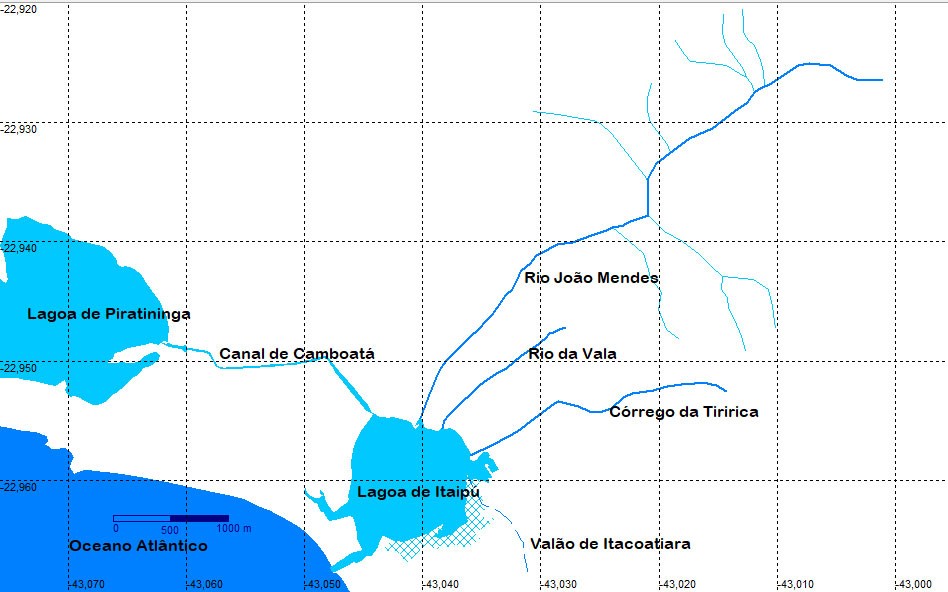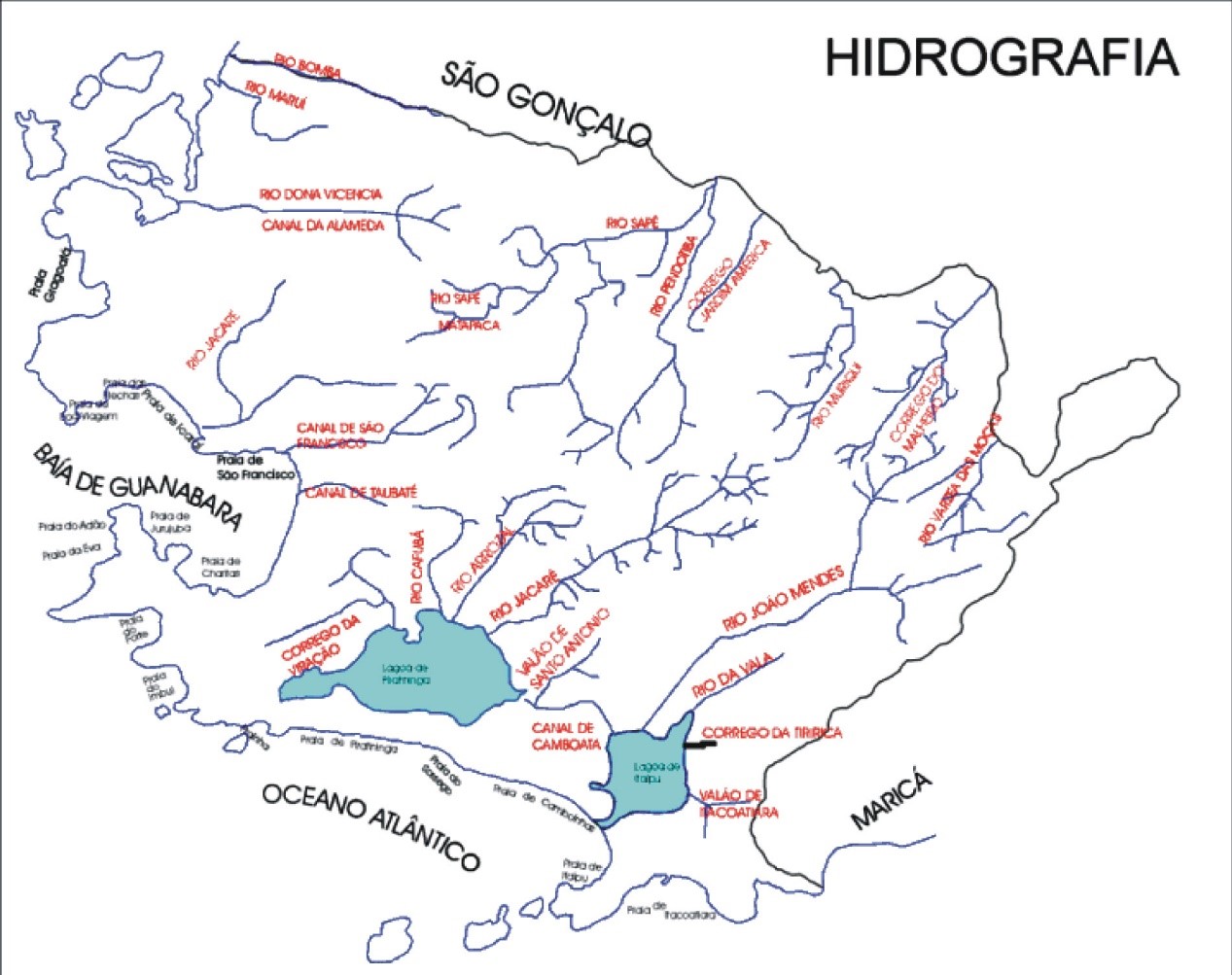 Rodrigues (2004) cita Tinoco (1995): “A Lagoa de Piratininga é a receptora dos rios Arrozal e Jacaré; e dos córregos da Viração e do Cafubá. A Lagoa de Itaipu é receptora dos Rios João Mendes e dos córregos da Tiririca e de Itacoatiara. Estes cursos d’água é que formam a Macrobacia da Região Oceânica do Sistema Lagunar Piratininga – Itaipu” (figura 2).