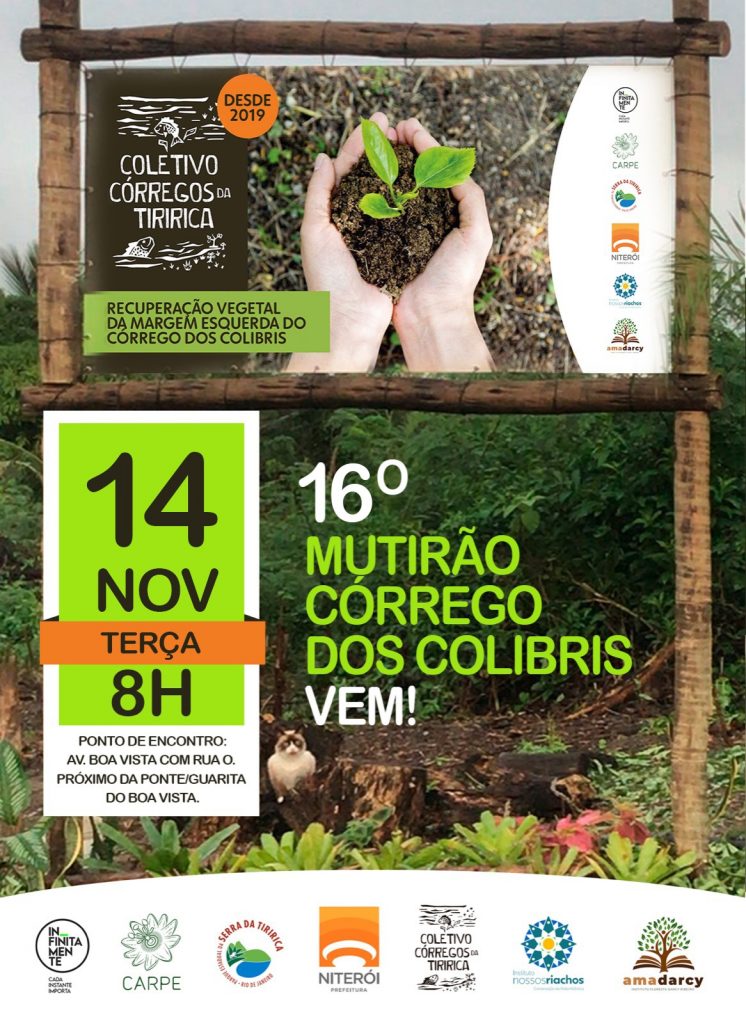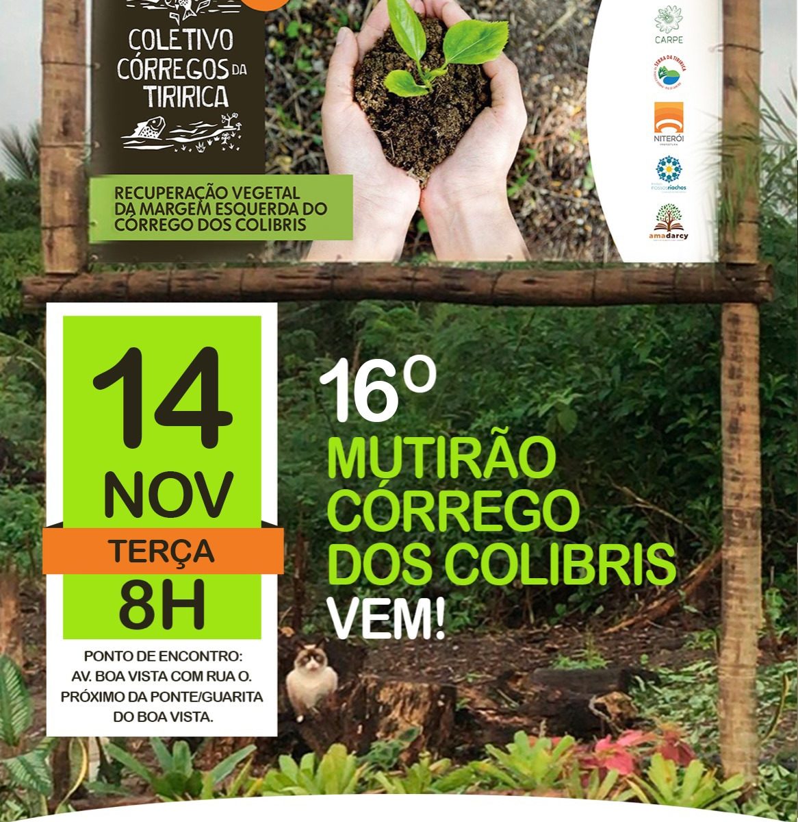 Convidamos a todos os membros do Coletivo Córrego da Tiririca e seus amigos, a participarem do décimo sexto mutirão. Com apoio da Amadarcy e de diversos voluntários e órgãos públicos, continuaremos o plantio de mudas e sementes.🤝🌱 Será realizada a construção de mais alguns ninhos, com o plantio de aproximadamente 100 mudas e muvucas de sementes.