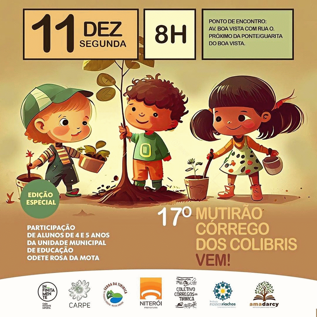 Edição Especial com a participação de alunos de 4 e 5 anos da Unidade Municipal de Educação Odete Rosa da Mota. Convidamos a todos os membros do Coletivo Córrego da Tiririca e seus amigos, a participarem do décimo sétimo mutirão. Com apoio da Amadarcy e de diversos voluntários e órgãos públicos, continuaremos o plantio de mudas e sementes.🤝🌱 Será realizada a construção de mais alguns ninhos, com o plantio de aproximadamente 100 mudas e muvucas de sementes.